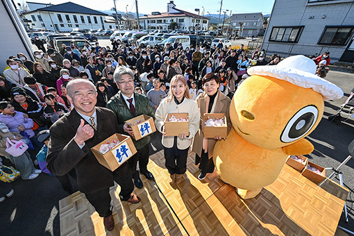 ※写真:餅まきの様子(左より野田村商工会長 佐藤 仁昭様、野田村長 小野寺 勝幸様、ダンスチーム「SUNLIGHT」代表 HINA先生、日本アムウェイ財団 代表理事 佟 嘉楓)