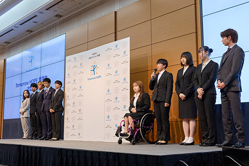 第三期奨学生として認定されたのは、2025年4月からの日本国内の大学・短期大学・専門学校進学者を対象とした一般公募の9名と、テンプル大学ジャパンキャンパス(TUJ)とのパートナーシップ奨学金プログラム「Tomorrow HOPE - TUJ スカラシップ プログラム」の1名による計10名。「学業も部活(スポーツ)も文武両道でがんばっていきたい」「数学者を目指しています」「夢はアニメの背景美術師になることです」「将来は子どもの貧困問題の解決に取り組んでいきたい」と学びへの意欲や夢を力強く発表する姿がとても印象的でした。